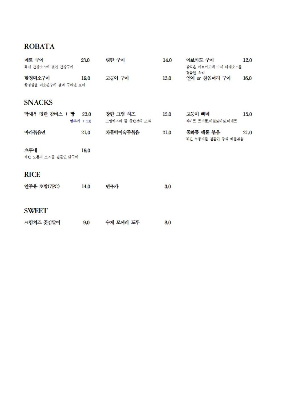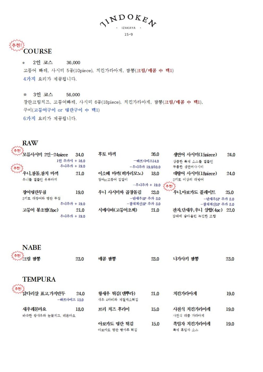 - 2인 코스 : 36,000 (고등어 빠테, 사시미 5종(10 pcs), 치킨가라아게, 짬뽕(매콤, 크림 택 1) )