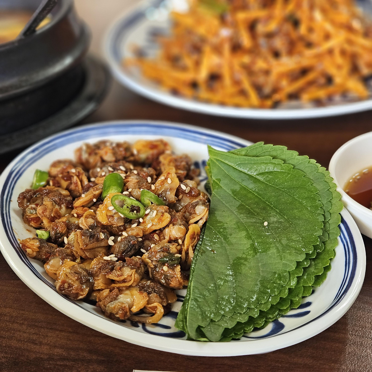 꼬막은 깻잎이랑 같이 나옵니다.