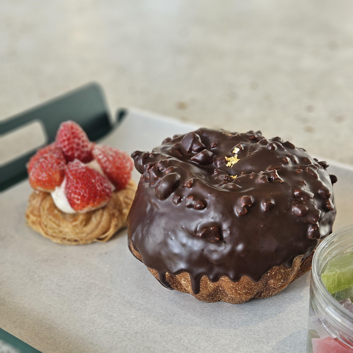 딸기 타르트랑 초코 있는 도넛 먹었습니다.