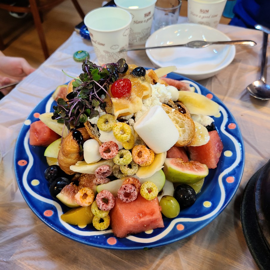 과일이 막 쌓여 나오는 후식은 발사믹 소스랑 리코타 치즈도 같이 뿌려지는데