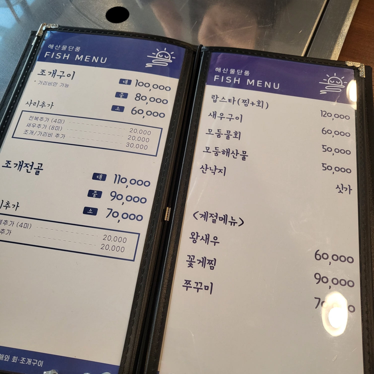 - 조개구이 : 대 100,000 / 중 80,000 / 소 60,000