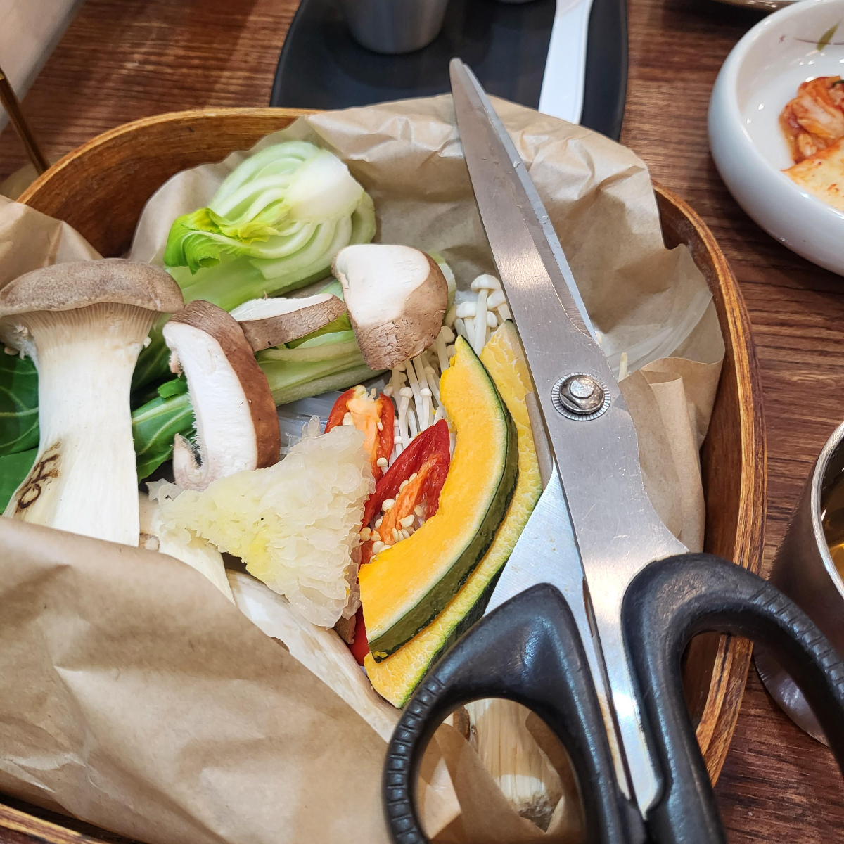 같이 먹는 채소는 파채, 청경채, 백목이버섯, 새송이버섯, 호박, 팽이버섯, 표고버섯 그리고 당면도 같이 나옵니다!