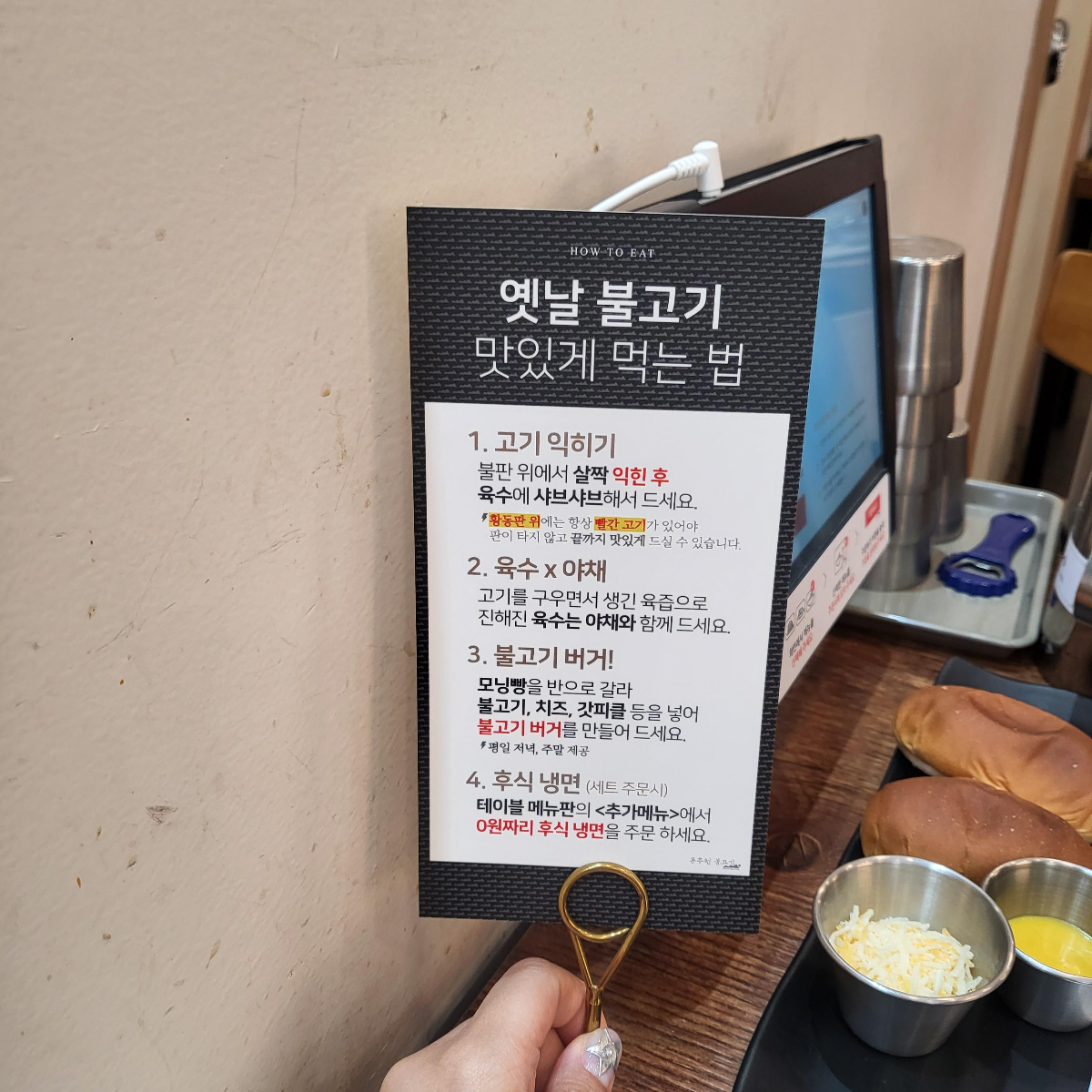 각 자리마다 옛날 불고기 맛있게 먹는 법이 적혀 있는데요.