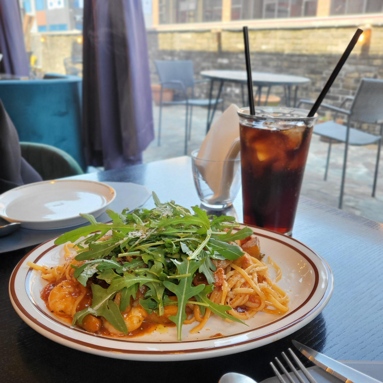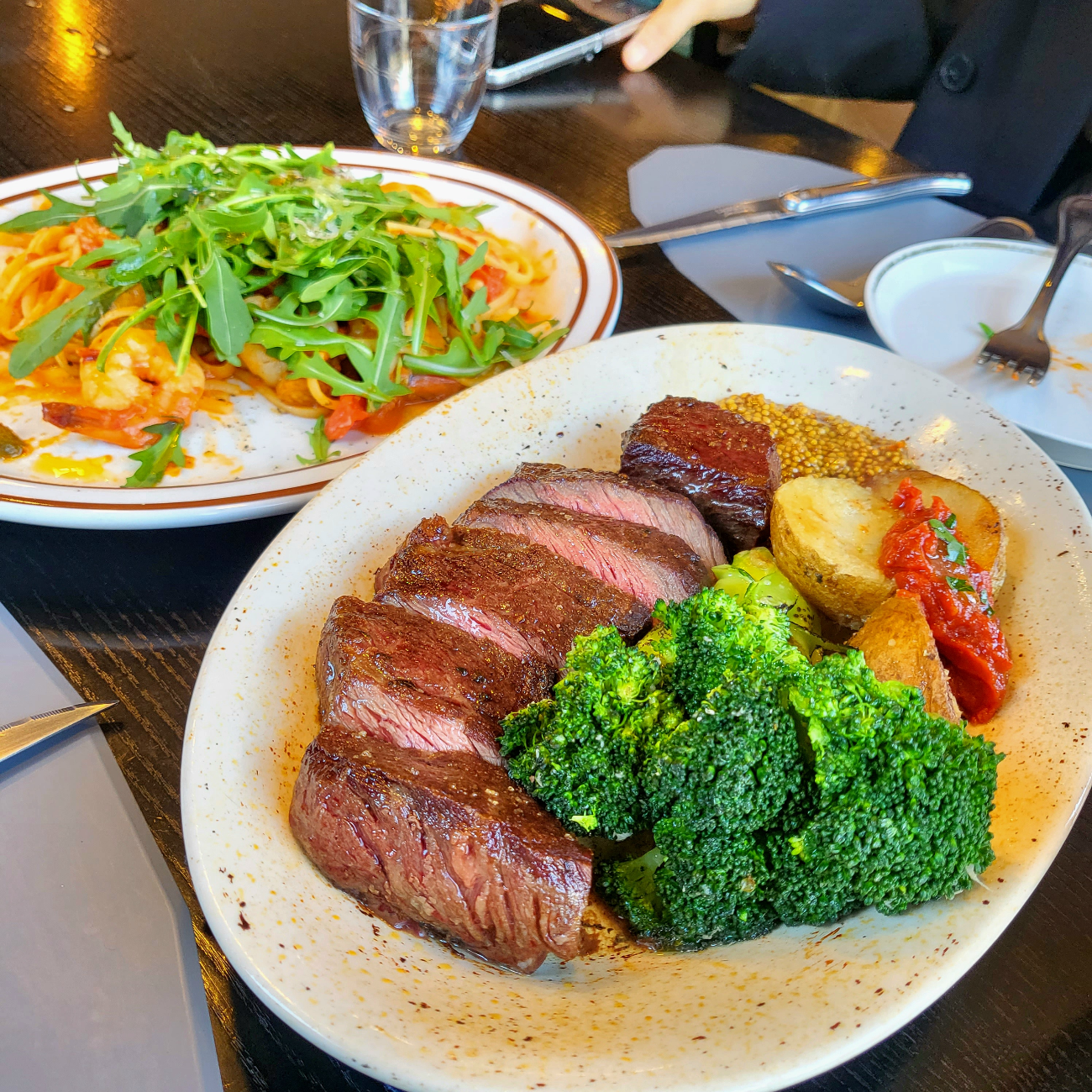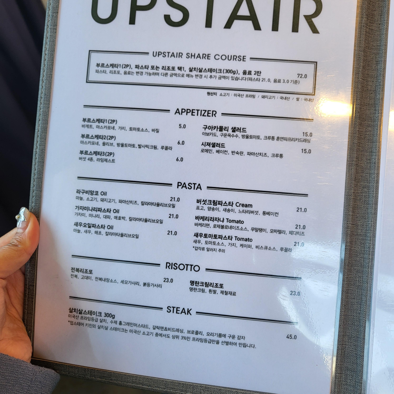 - 업스테어키친 음식 - 살치살 스테이크, 새우토마토파스타