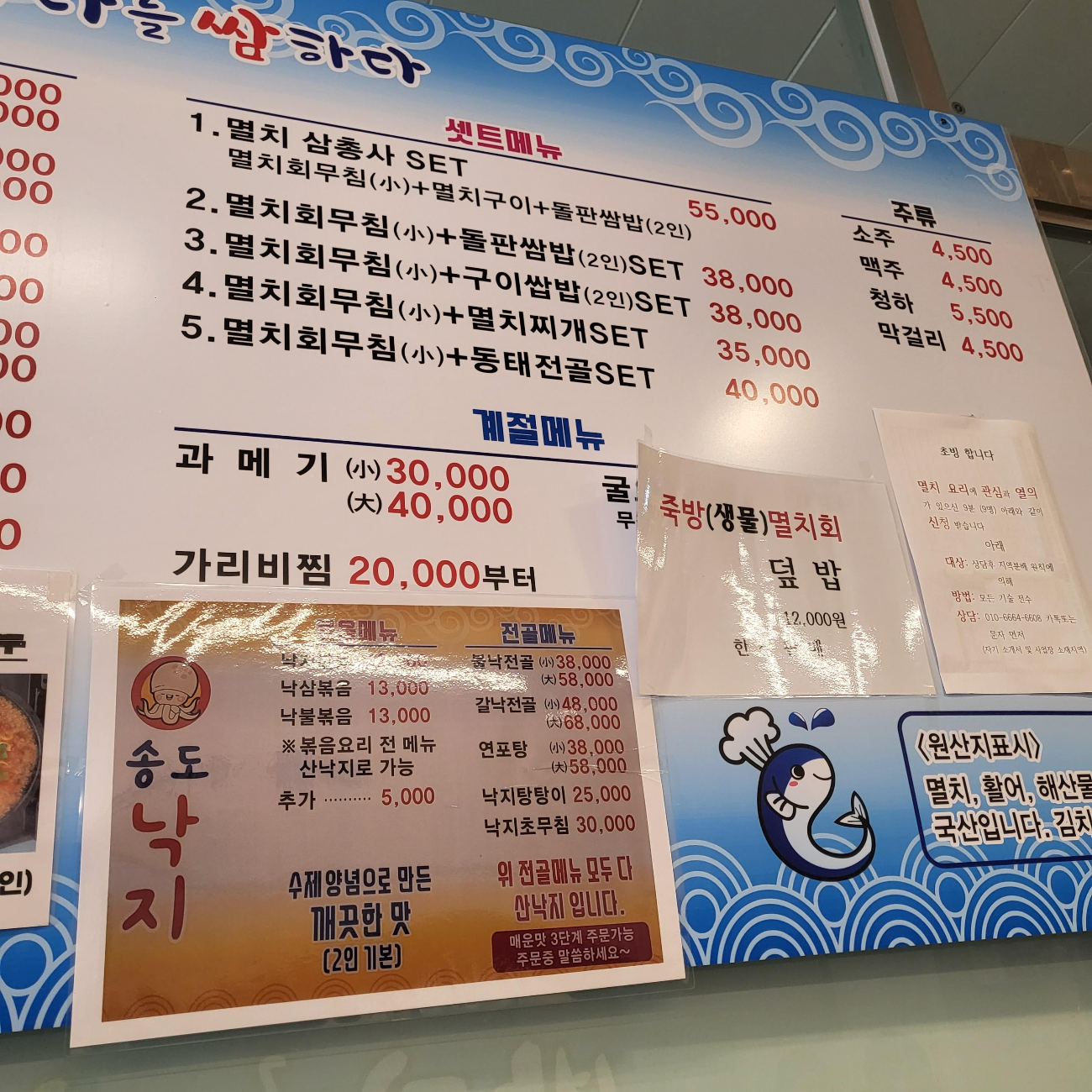 - 멸치회무침 : 소) 22,000 / 대) 32,000 (생물회로 변경 시 10,000 추가)