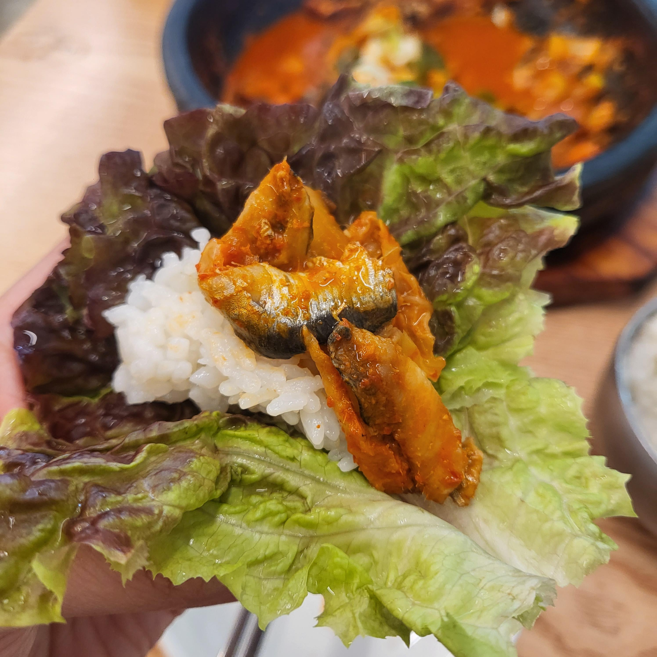 맛은 고등어조림 같은 느낌이에요! 그래서 밥이랑 양념이랑 비벼서 먹어도 맛있고 그냥 쌈으로 얹어서 먹어도 맛있어요.