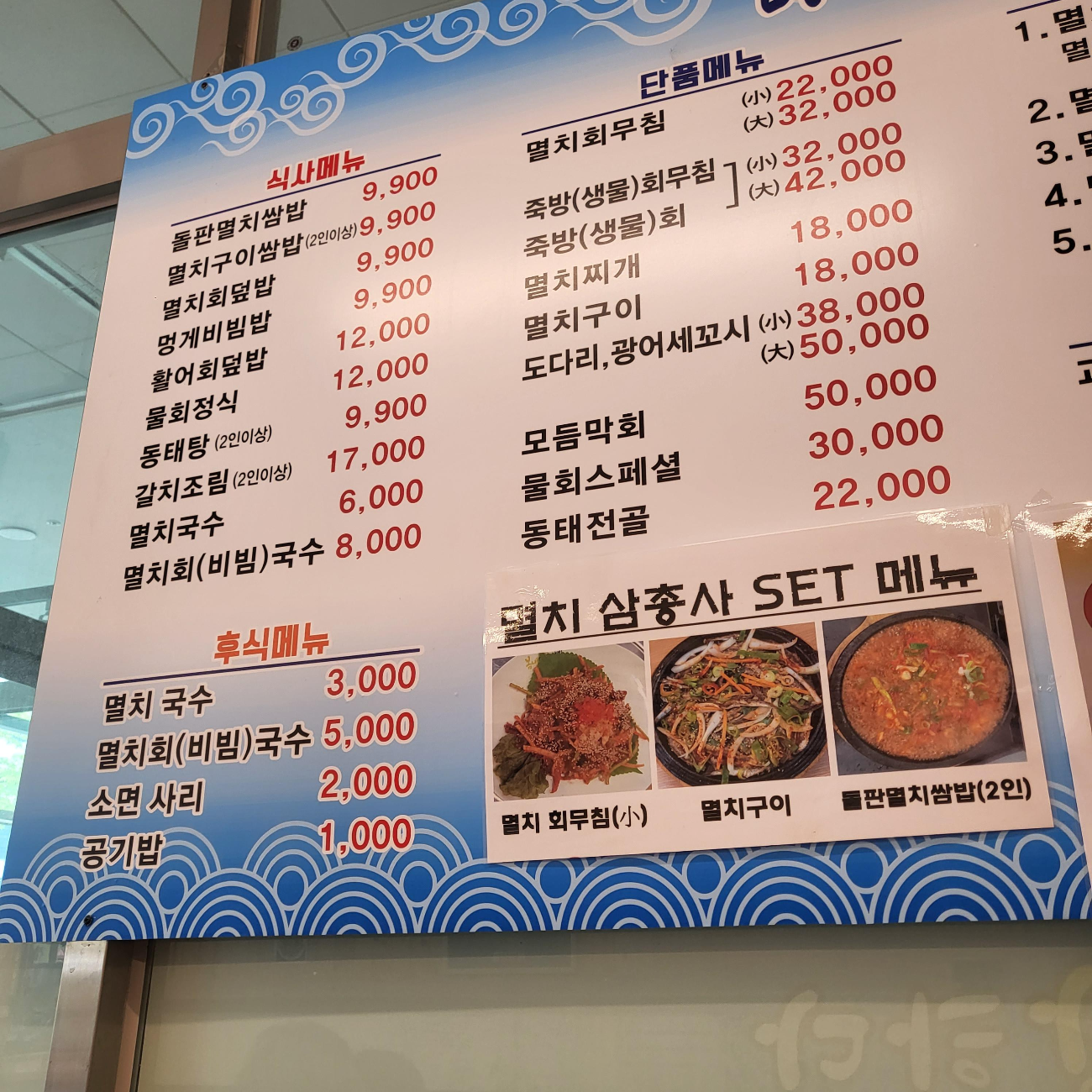- 멸치회무침 : 소) 22,000 / 대) 32,000 (생물회로 변경 시 10,000 추가)