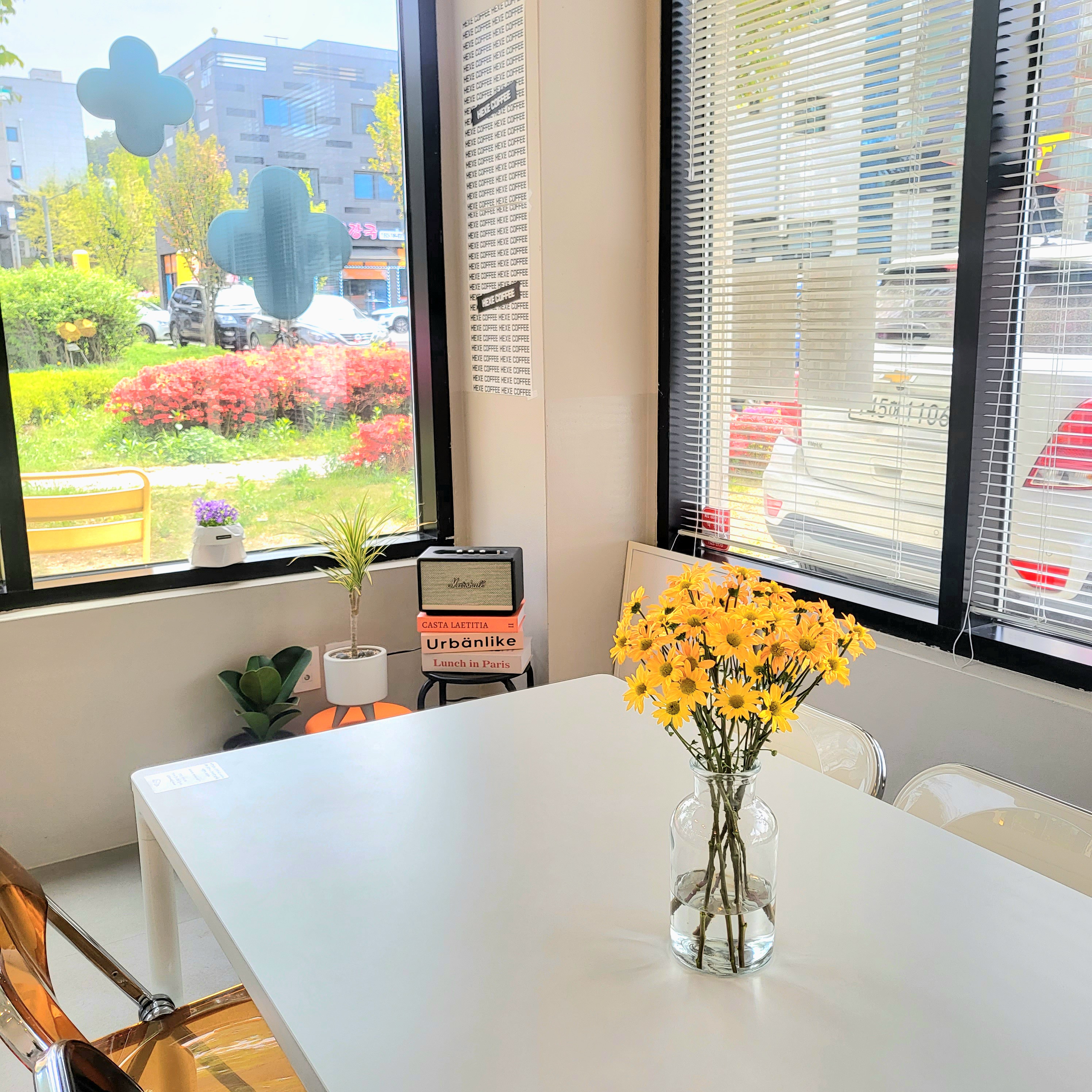 가게는 아기자기하니 꽃집도 같이 운영하고 있어서 테이블마다 생화장식이 하나씩 있습니다.