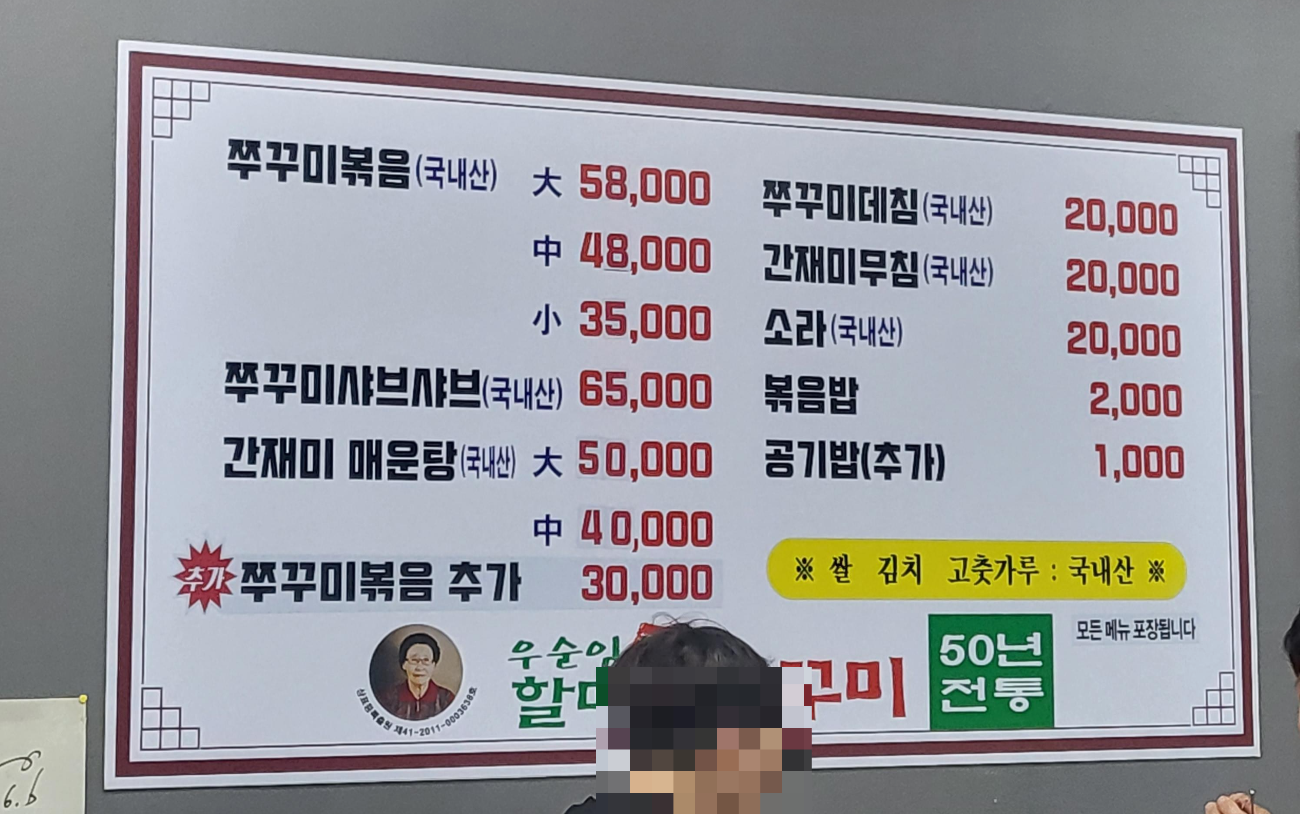 - 쭈꾸미볶음 : 대 58,000 / 중 48,000 / 소 35,000