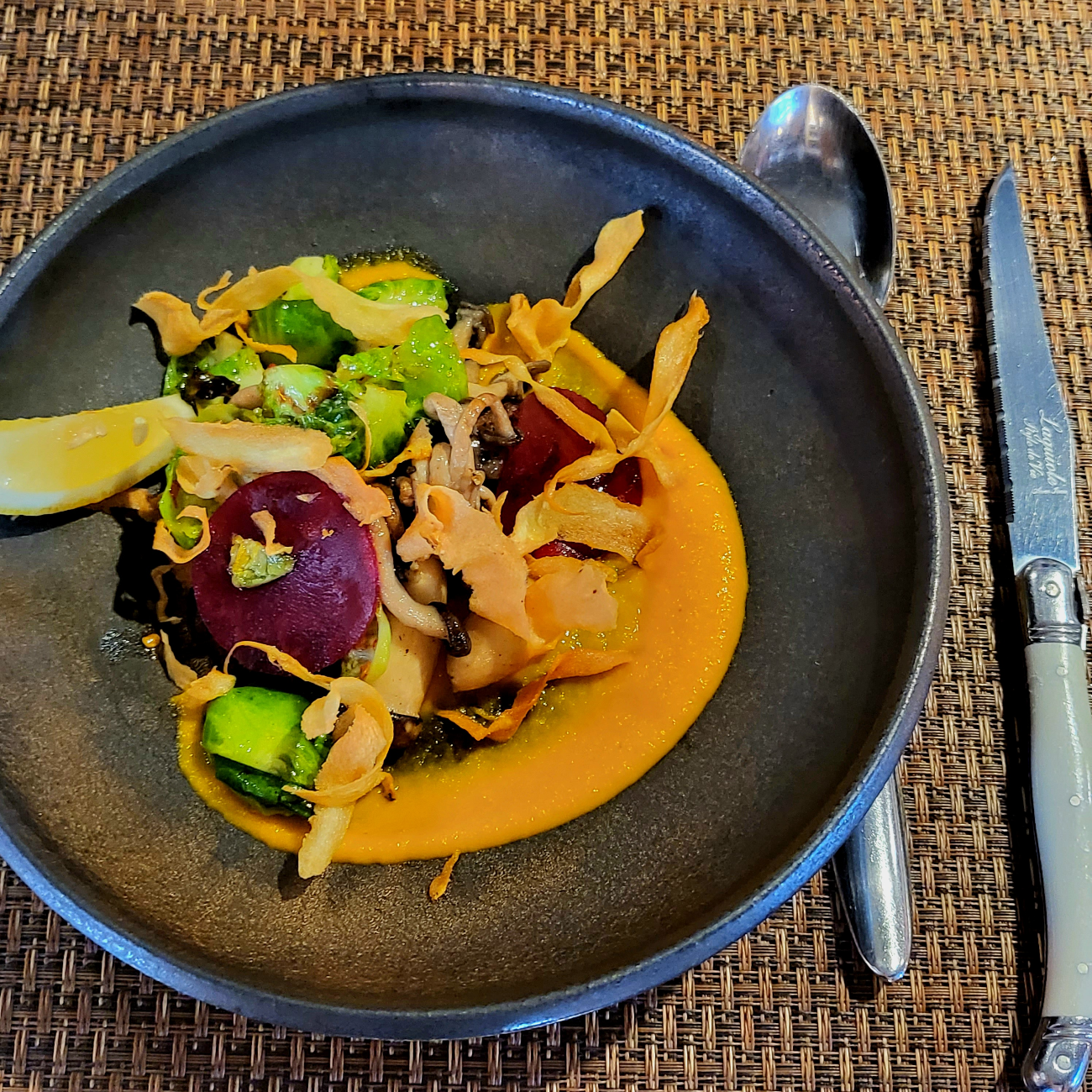 구운 버섯과 당근퓨레, 비트 피클이 들어가 있습니다.