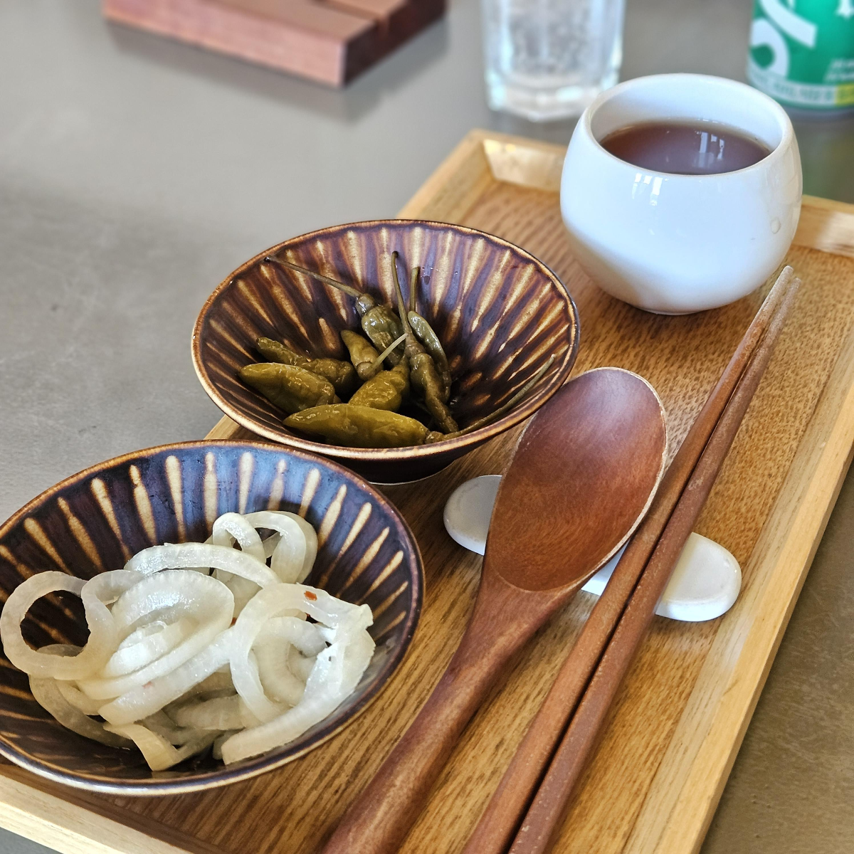 기본 찬은 고추절임이랑, 양파절임이 나오고 따뜻한 차가 함께 나옵니다.